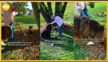 From Good Morning America. Barbara, 96, is getting a helpful paw from Chewy the Newfoundland, who digs the perfect hole for planting flowers.